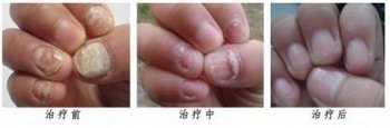 【治疗效果】:何女士2014年3月11日到院治疗,经过贾勇主任两次治疗后,灰指甲明显好转;3月22日,经过5次治疗后,手指灰指甲缩小了80%;3月24日,左手的灰指甲脱落,全手指恢复正常,结束治疗。